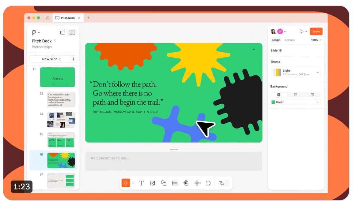 Example: Creating a product launch presentation, you can use Figma Slides to design each slide with a consistent look and feel, ensuring that your presentation is professional and visually appealing.